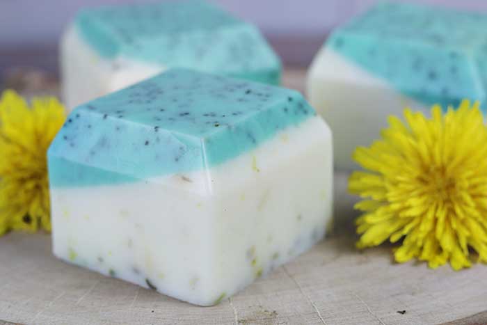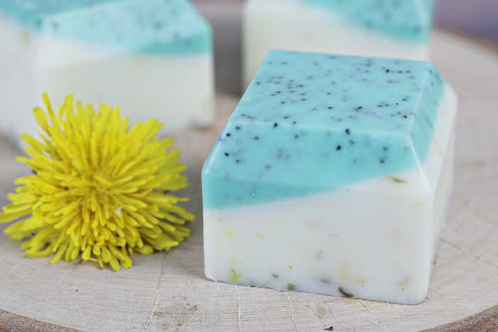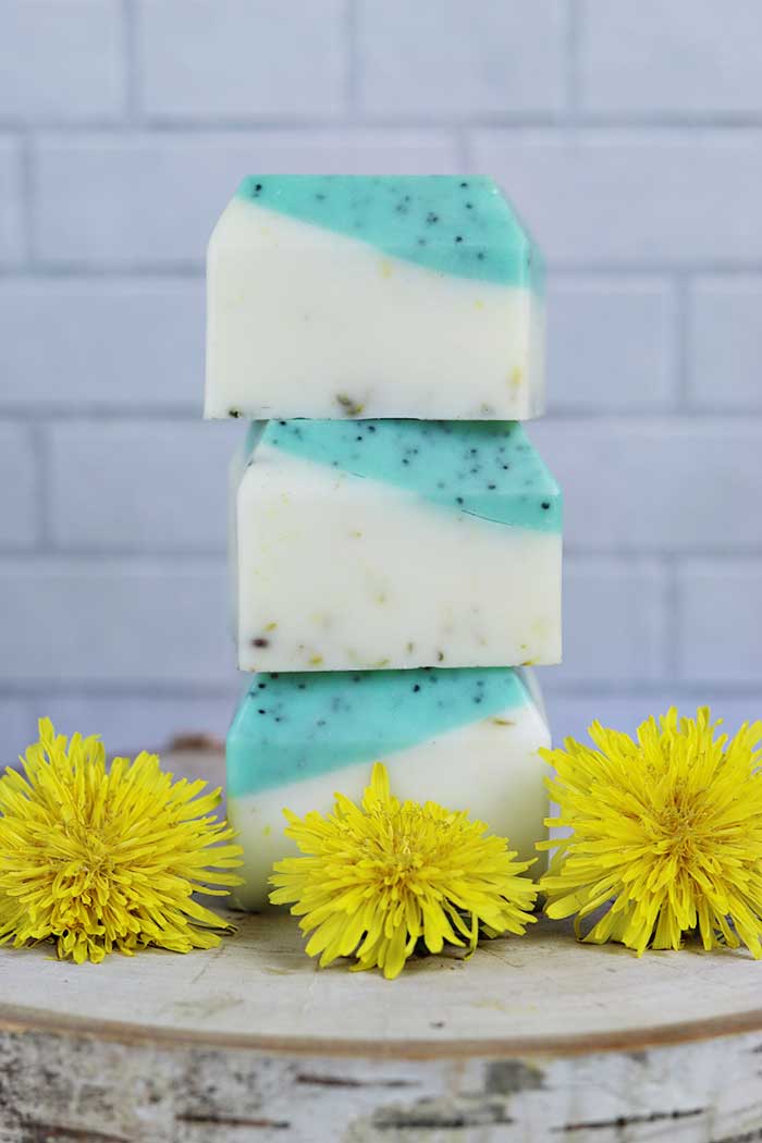 How to make dandelion melt and pour soap recipe for dry skin. This easy recipe has dandelion infused oil added to moisturize dry skin. The bottom layer exfoliates naturally with poppy seeds, and the top moisturizes and soothes skin with dried calendula and essential oils.