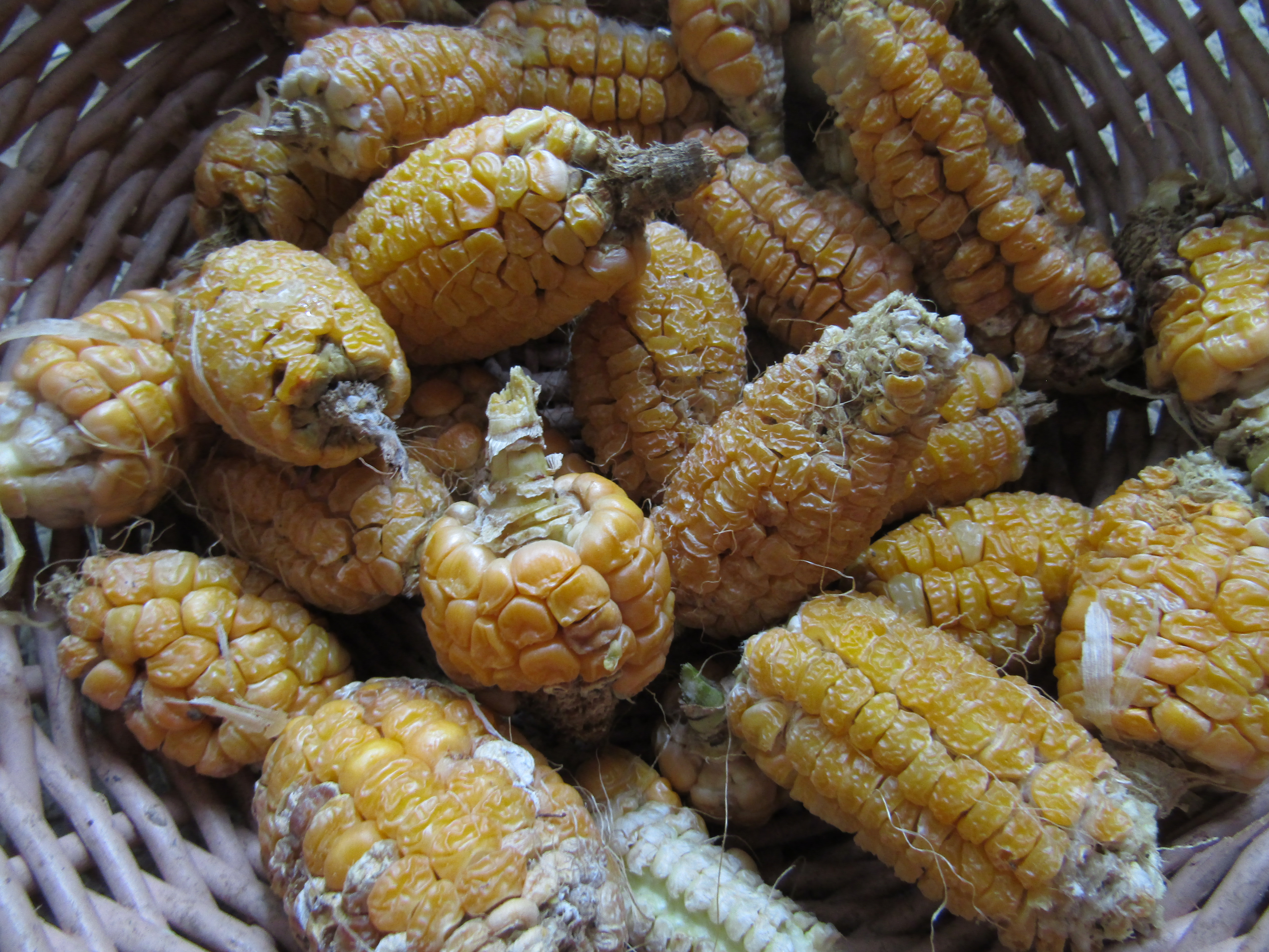 A goal was to have at least 52 quarts of tomatoes on the shelf by end of summer, one for each week of the coming year. I just barely achieved that on Wednesday. We've had years when there was little to none to put up, only some for fresh eating, so if I can put even more up, I'll be thankful. Quite a few of the tomato plants are dead or dying, and none set fruit recently, with temps in the 90's. I'm hoping now that it's cooling off, some of the plants will get a second wind. We have to keep McNibs out of the garden, or he will help himself to tomatoes too. Guinness comes in with me each morning when I'm picking, and both get a cherry tomato. We've got several little melons on the vine, and one that's 8" long. A pan of egg shells was crushed, and added to the compost bin. When we picked our first round of corn, there were quite a few tiny ears, 2-3" long. We didn't want to mess with them for fresh eating, but the Seneca Sunrise corn we're growing is also said to make nutty, sweet cornmeal. I pulled and shucked those ears, and they're finishing drying in the house.