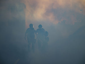 Police officers walk through a cloud of tear gas, Thursday, May 28, 2020, in St. Paul, Minn. Protests over the death of George Floyd, a black m...